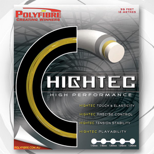 Using a patented new age production process, the Hightec range is a breakthrough of poly technology that enhances the comfort and gut-like elasticity. Poly Hightec incorporates carbon additives to form a new molecular structure providing substantial elasticity with excellent tension holding, and durability. This range has been tested on the toughest ATP circuit around the world, and is now available in an incredible range of diameters to suit any game style. Thinner diameters provide greater power and control, whilst the thicker diameters provide sustained durability. The Hightec range is the perfect substitute to natural gut and other multifilament strings. Also popular for use in hybrid stringing.